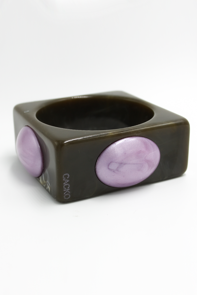 Gold-colored steel ring with hematite, mother-of-pearl, and garnet.
