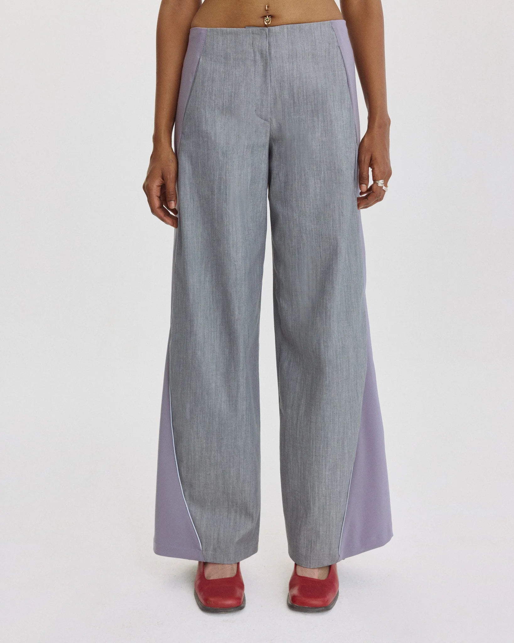Unisex trousers combining denim and cotton panels at the front and back for a streamlined silhouette. Featuring a boxy, relaxed fit, accented with silver reflective piping for subtle visibility. Rendered in a soft grayish-purple hue.