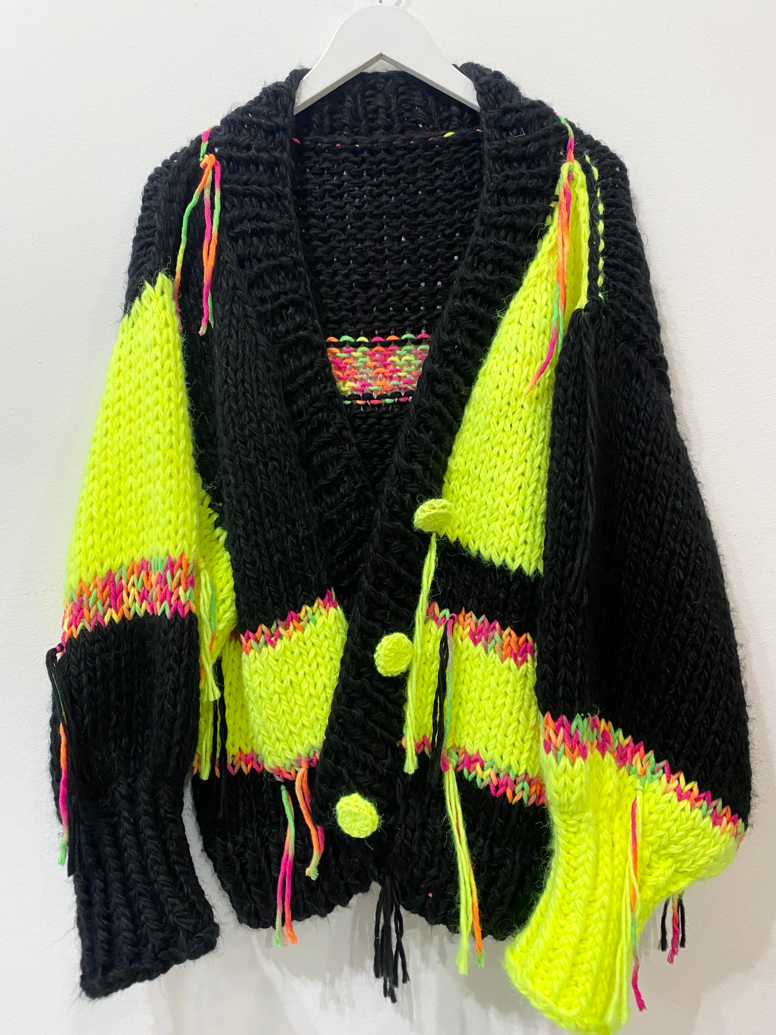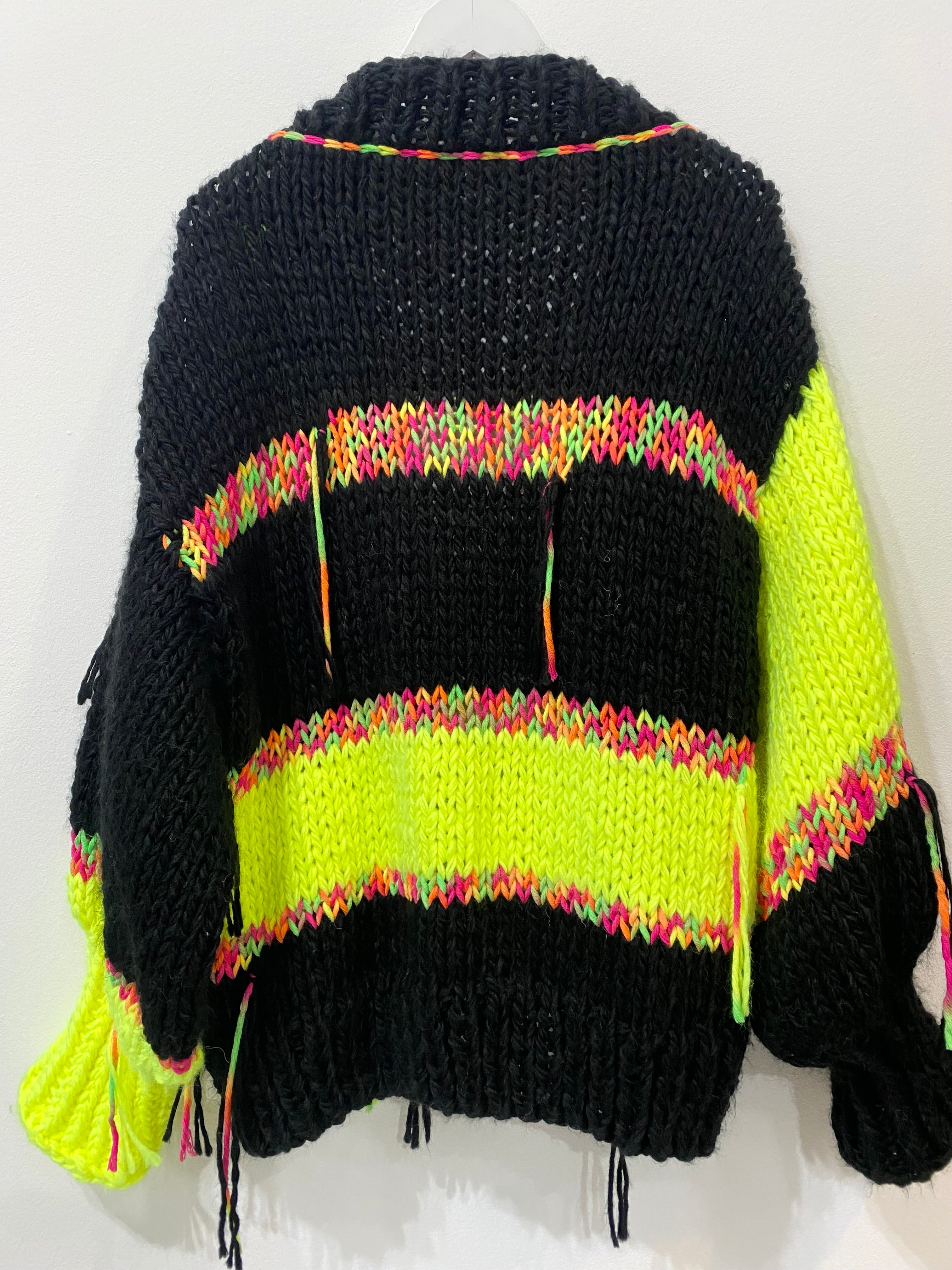 Where traditional craftsmanship meets electric energy. Hand-crafted in Poland from 80% thick, premium local wool, this sweater is built for those who don’t do "subtle." A deep black base creates the perfect canvas for electric neon accents and flashes of soft pink yarn, making every piece a unique work of wearable art.