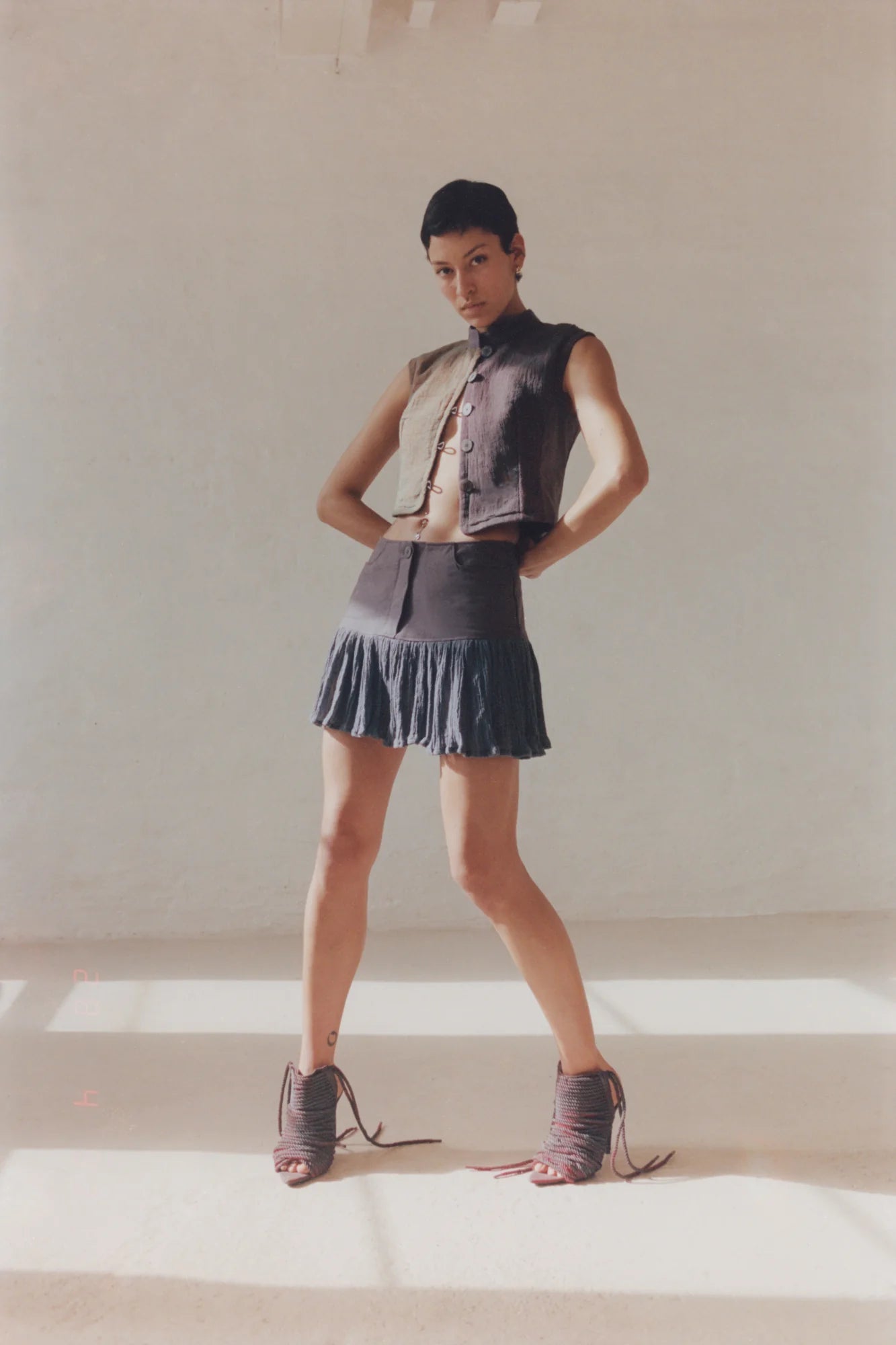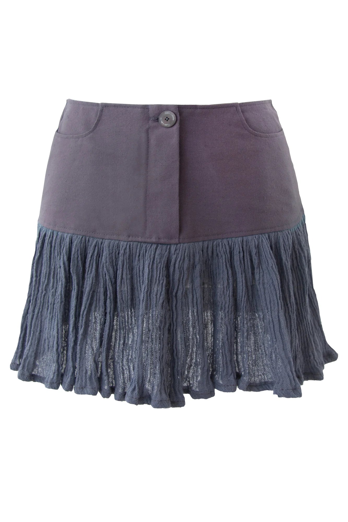 Playful mini skirt that combines sturdy denim and technical GAUZE to create a unique summer look. The gathering of technical gauze throughout the hip line creates a flounce and flared shape. Finished with front zipper and logo button and side pockets. The combination of cotton textiles ensures comfort and breathability.