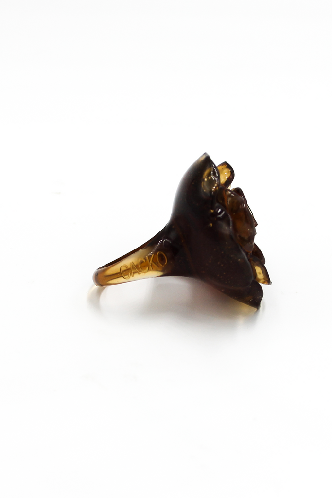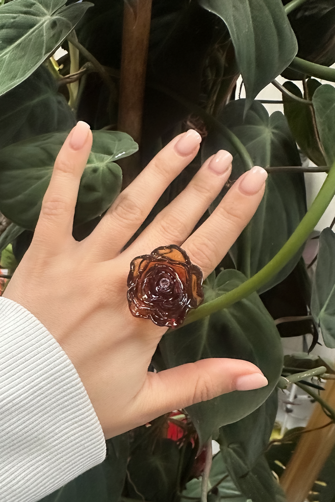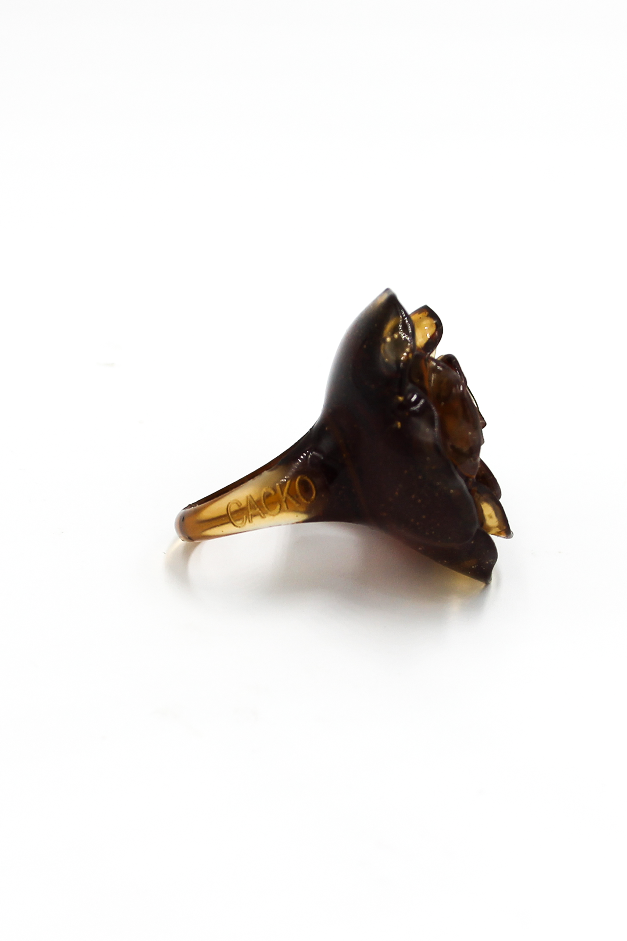 A brown base in a milk chocolate shade embraces a delicate pink zirconia, which shimmers like a ray of sunlight reflected in the surface of the resin. It is a combination of elegance and the warmth of nature, perfect for people who love a gentle sparkle and artistic details.
