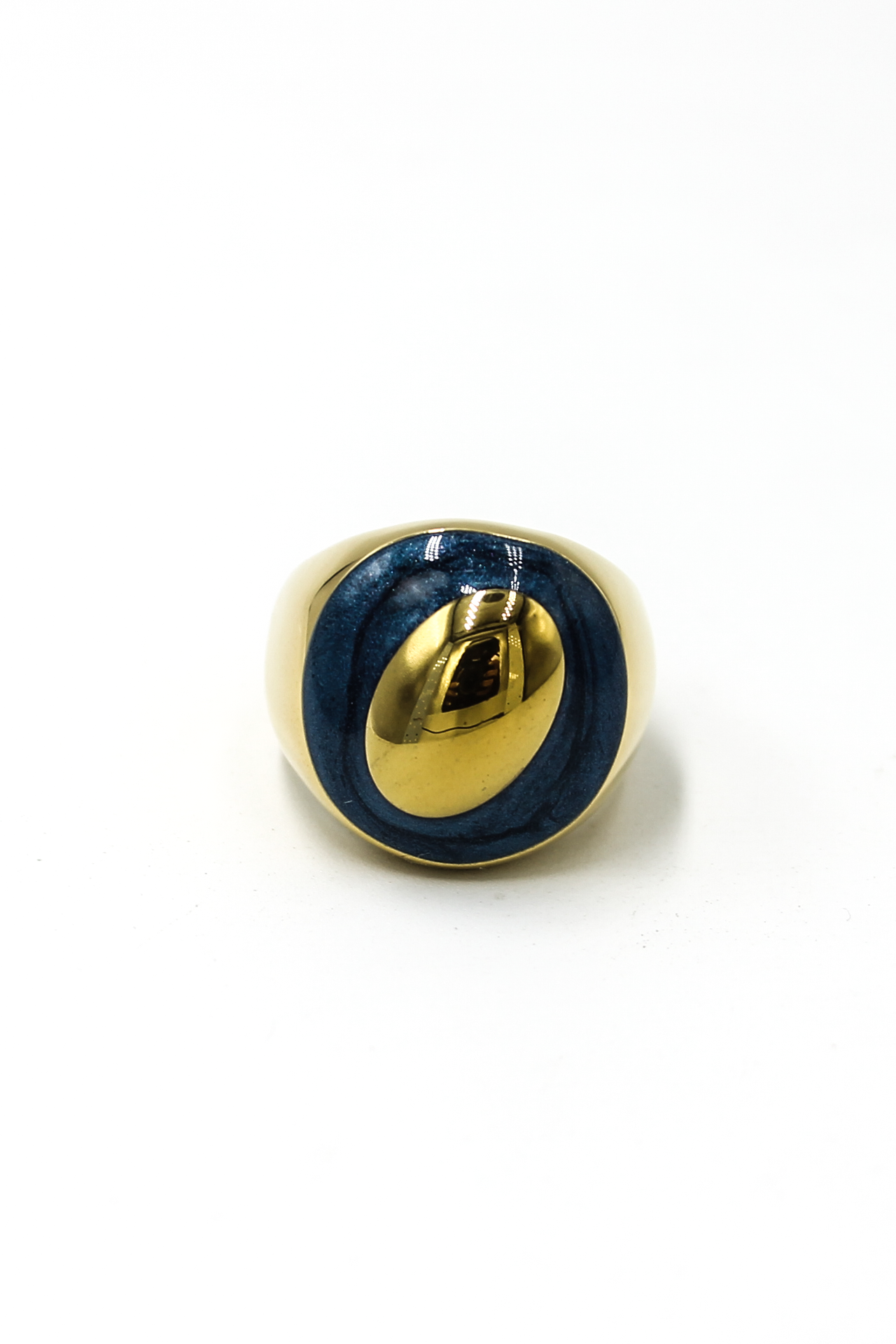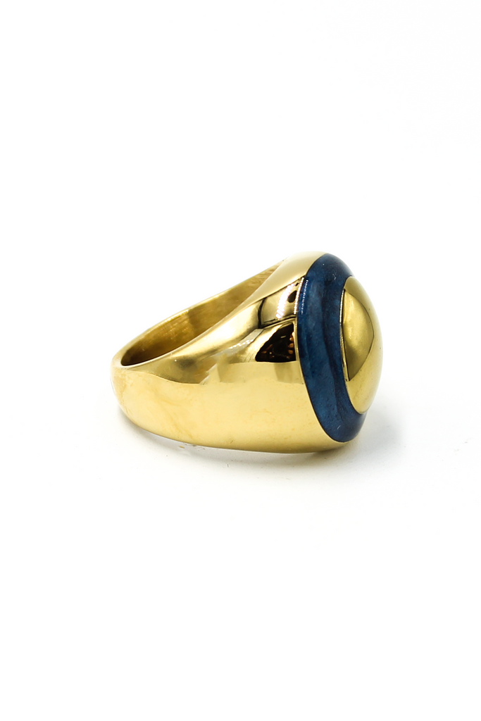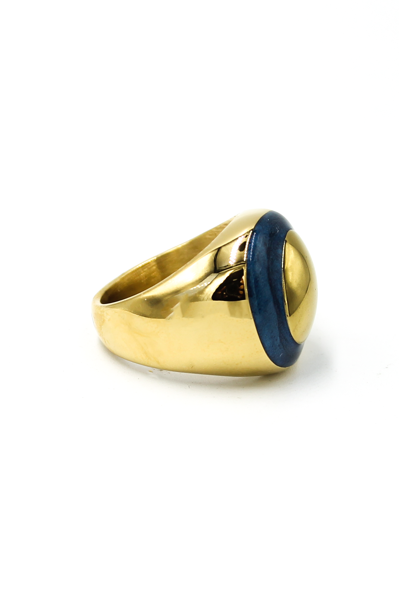 Gold-colored steel ring with hematite, mother-of-pearl, and garnet.