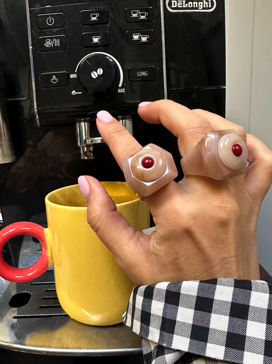 The ring works perfectly as an accent for simple outfits or as a key element that builds your entire look—modern, artistic, and with a slight retro-future twist.