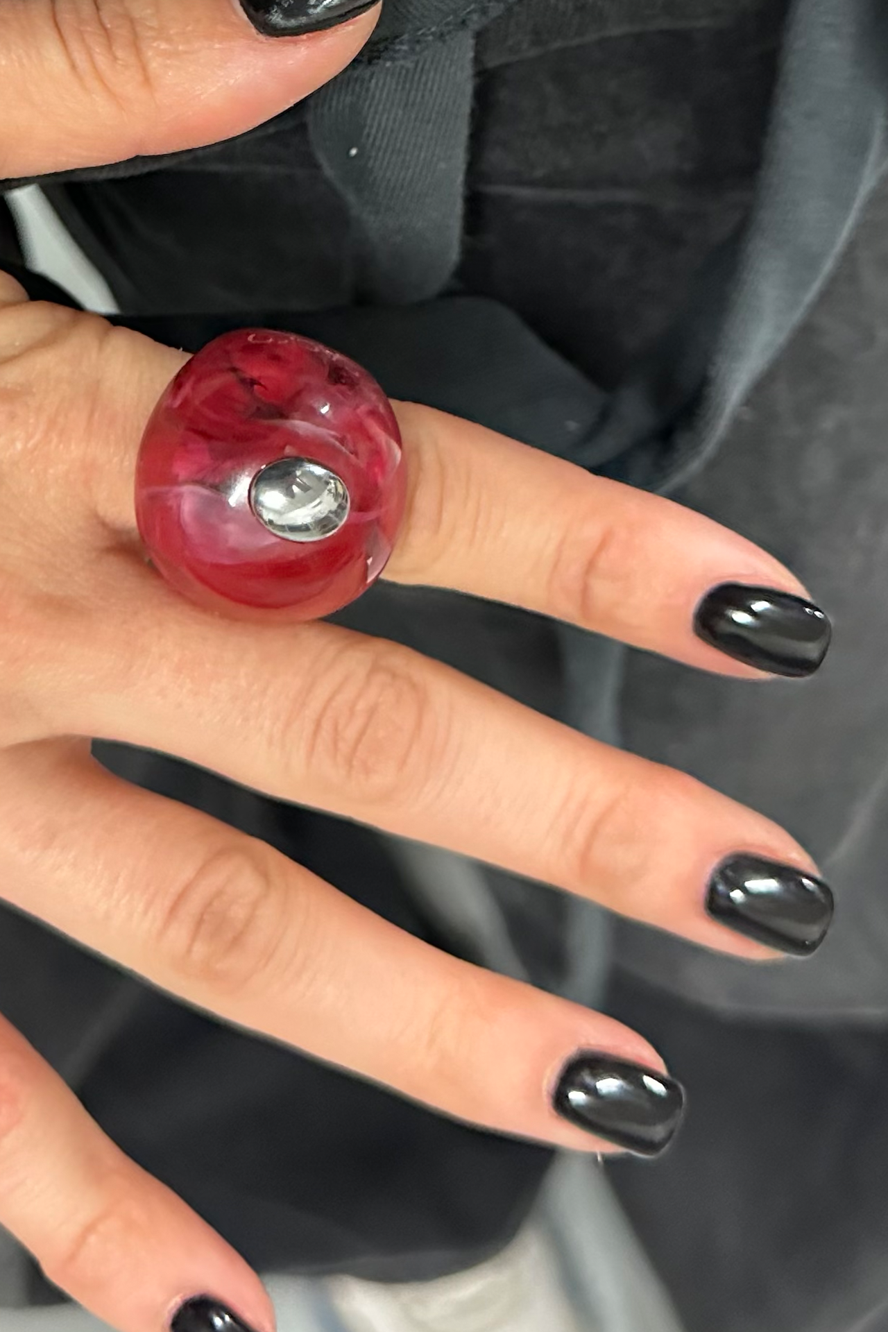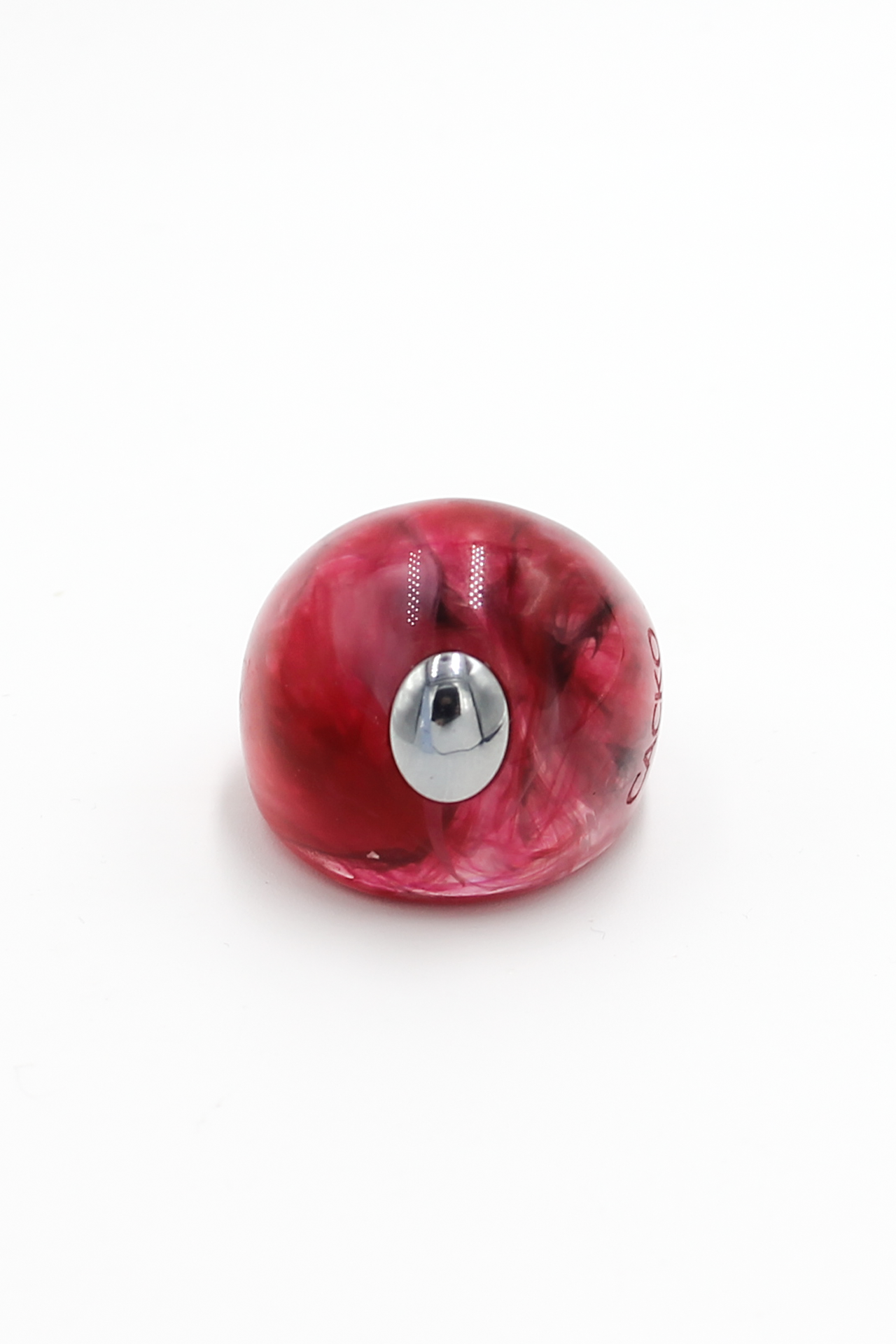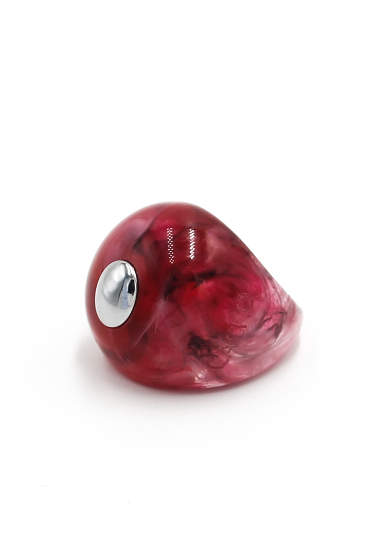 This original, circular ring is one of the most distinctive statements from the CACKO collection. Crafted from resin in shades of raspberry and burgundy, the colors blend to create a unique, "stone-like" texture. Because of this artisanal process, no two pieces are alike—making every ring a complete original.