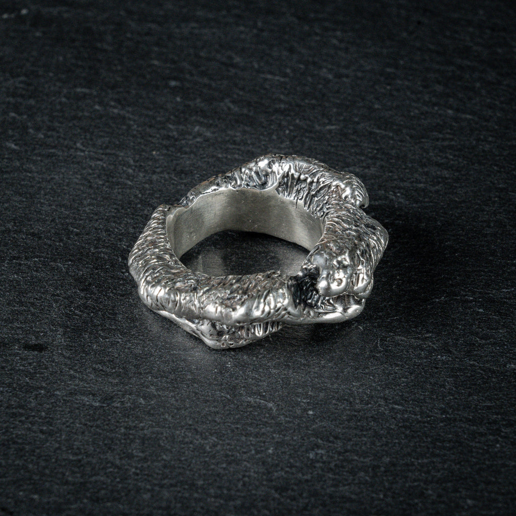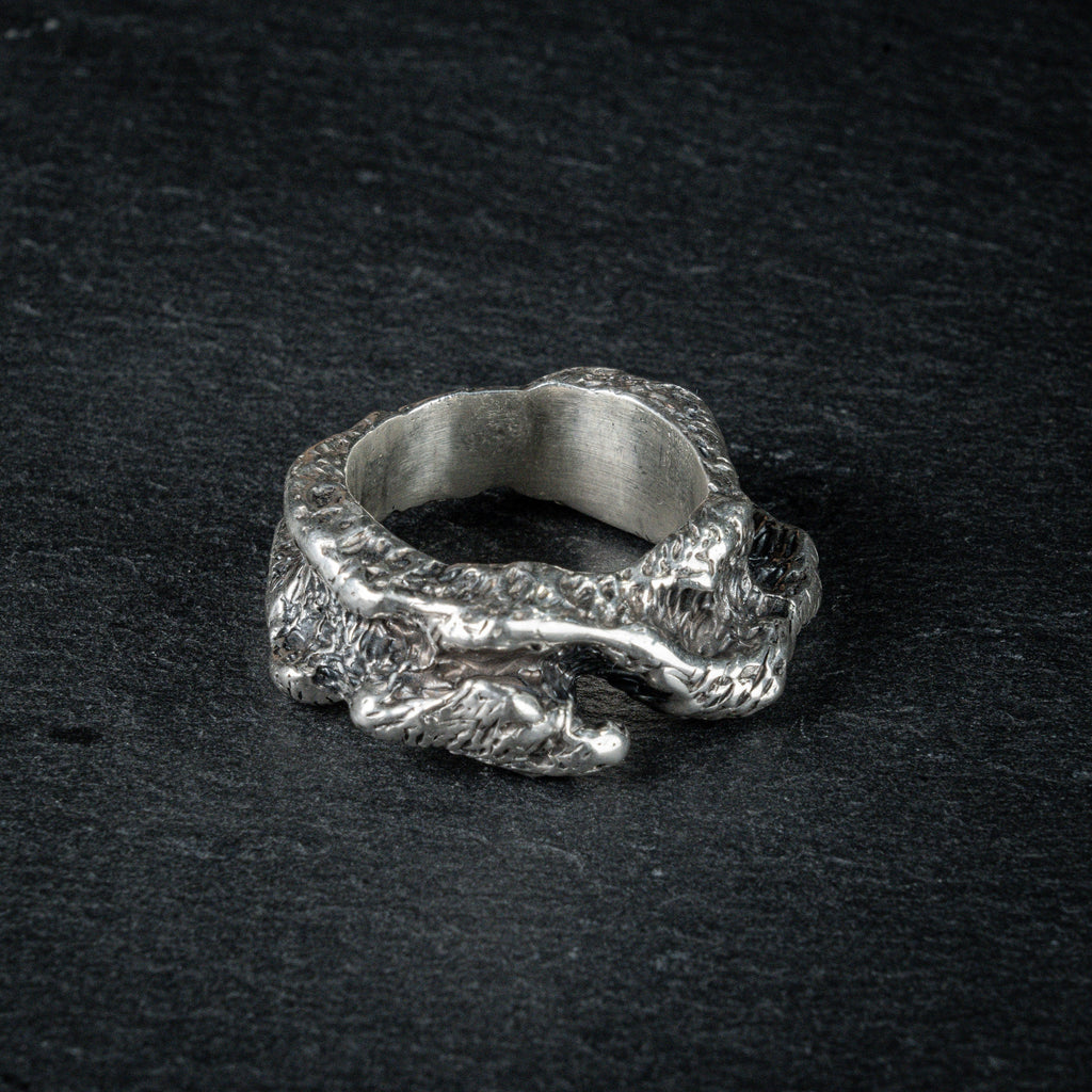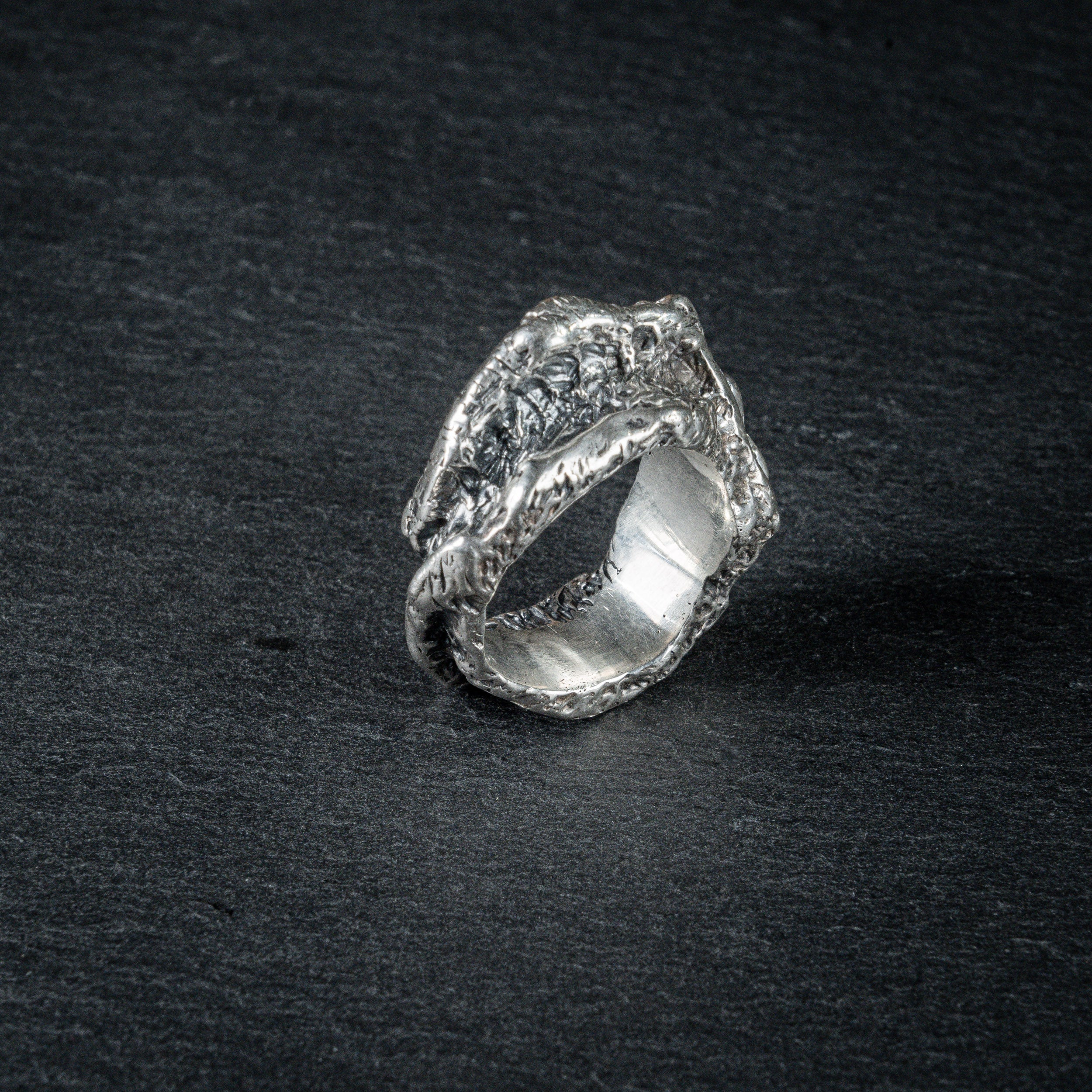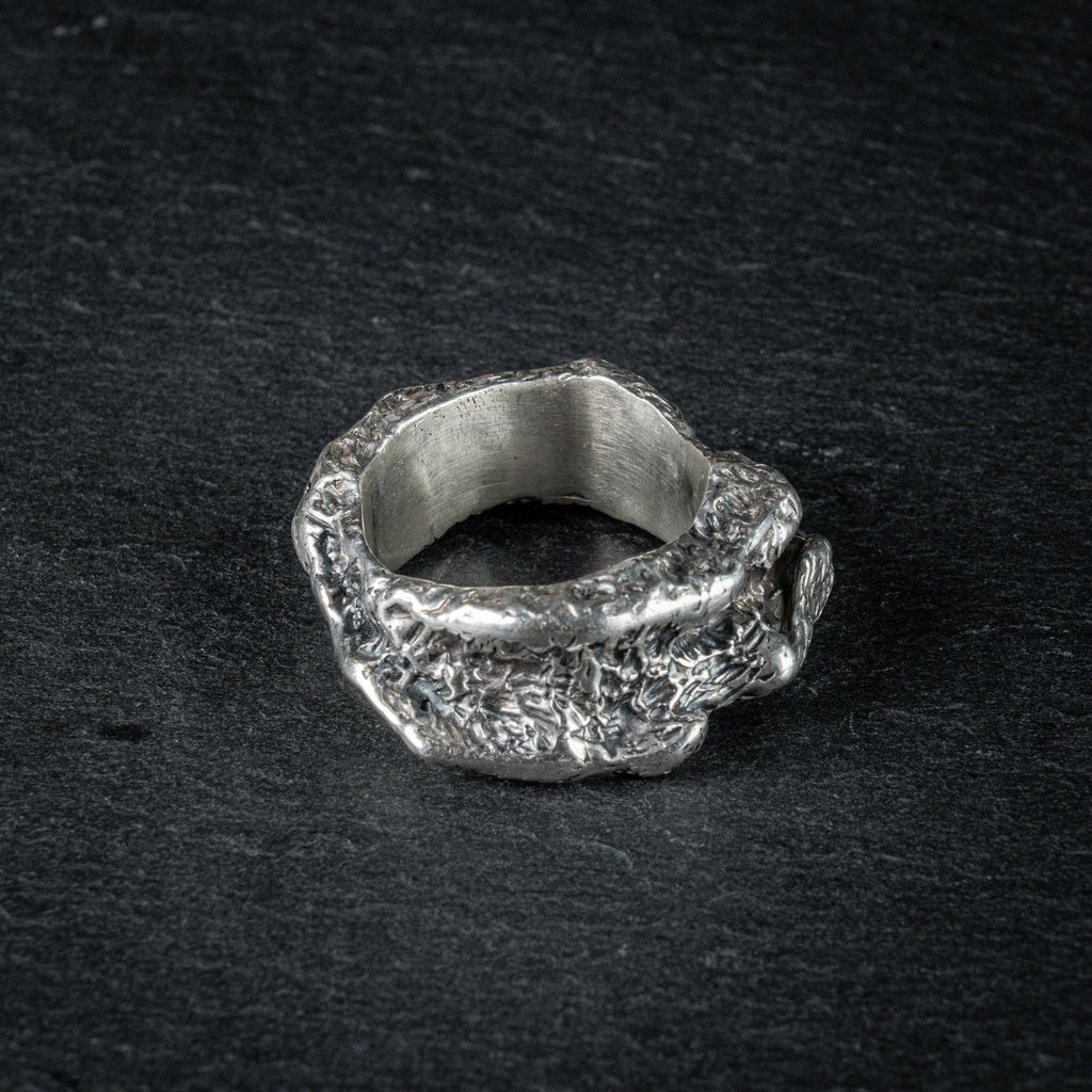 VEORUN, features a dynamic, textured surface that evokes the fierce energy of an eruption, as reflected in its Icelandic name. Its design incorporates bold, irregular patterns and bursts that mimic the chaotic flow of molten lava and ash. The ring’s jagged edges and fiery details reflect the intense heat and force of a volcanic eruption, creating a striking visual impact.